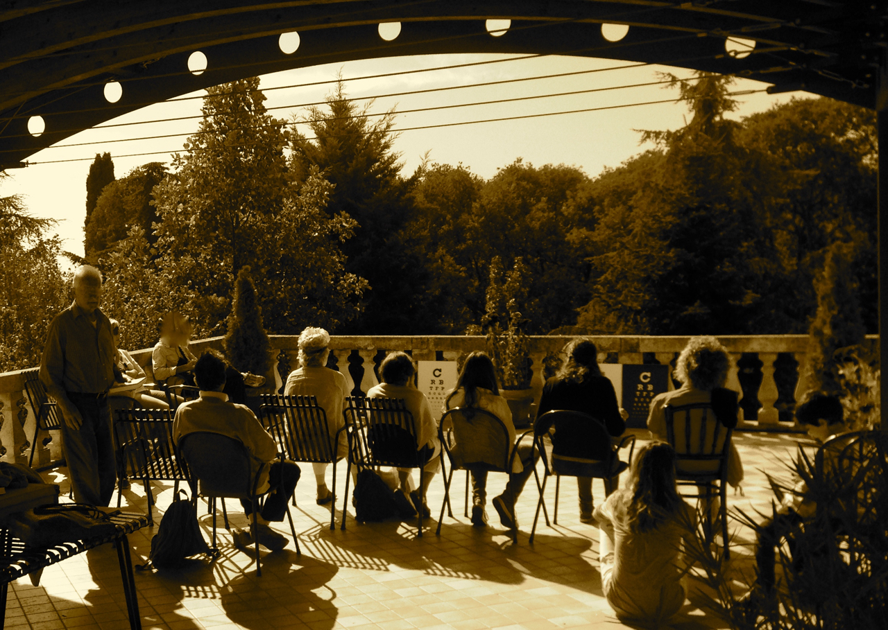 In questa istantanea antichizzata alcuni socii della AVP prendono comodamente il sole in terrazza esercitandosi con le tabelle di controllo di Snellen a 10 e 15 piedi.