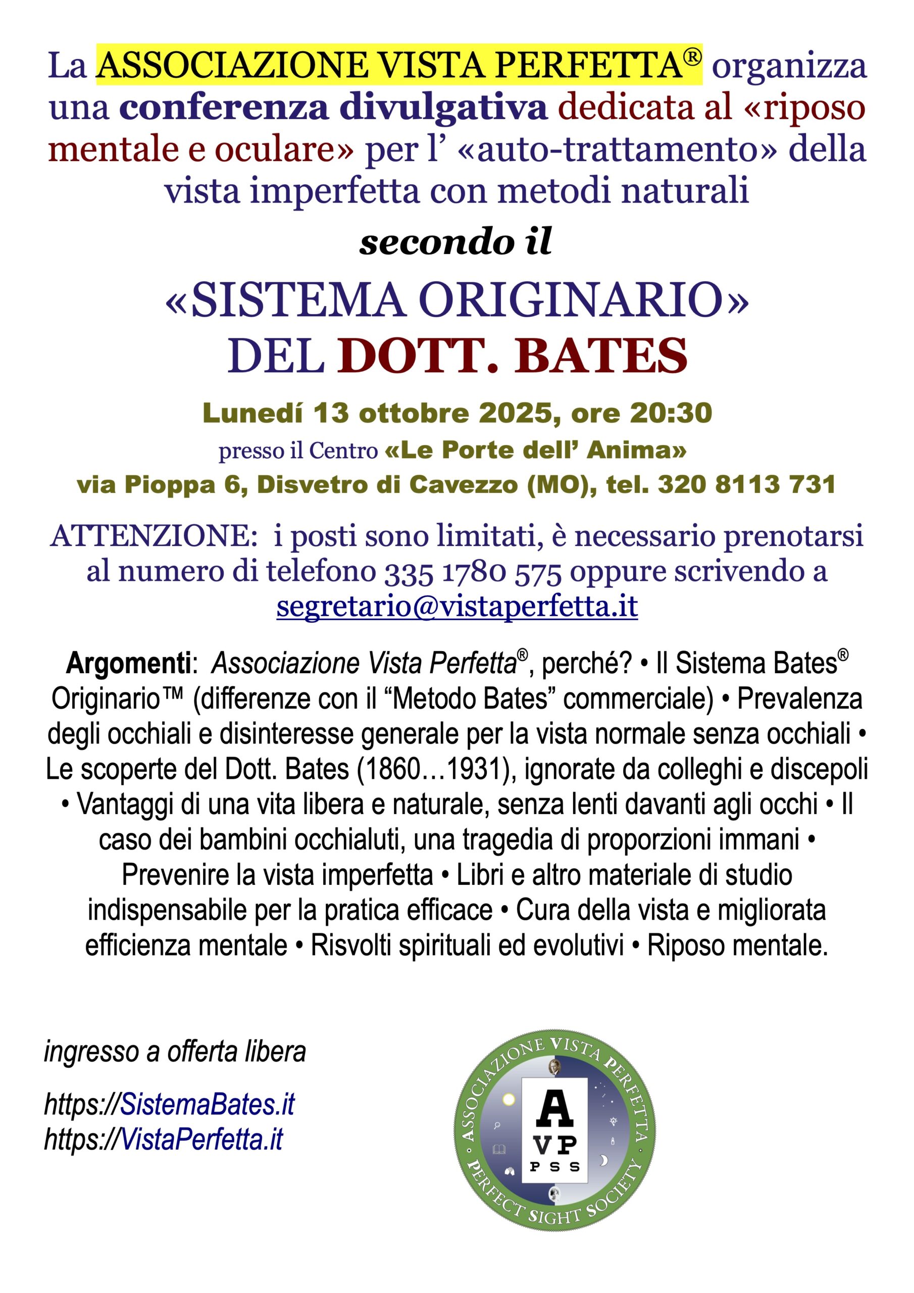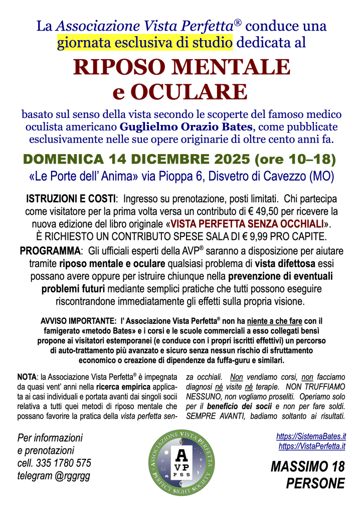 Lunedì 13 ottobre 2025, sempre su iniziativa della nuova socia Sabrina di Modena, la AVP® ha svolto una conferenza divulgativa sulle sue attività per la diffusione dei concetti del riposo mentale, come da noi applicati in tempi moderni, facendo riferimento alle pubblicazioni originali del Dott. Bates come rese disponibili al lettore italiano a partire dall’ anno 2002 dalla Casa Editrice delle Consulenze Gioviali .it® di Milano (direttore RGG), titolare del marchio collettivo Sistema Bates® Originario™.