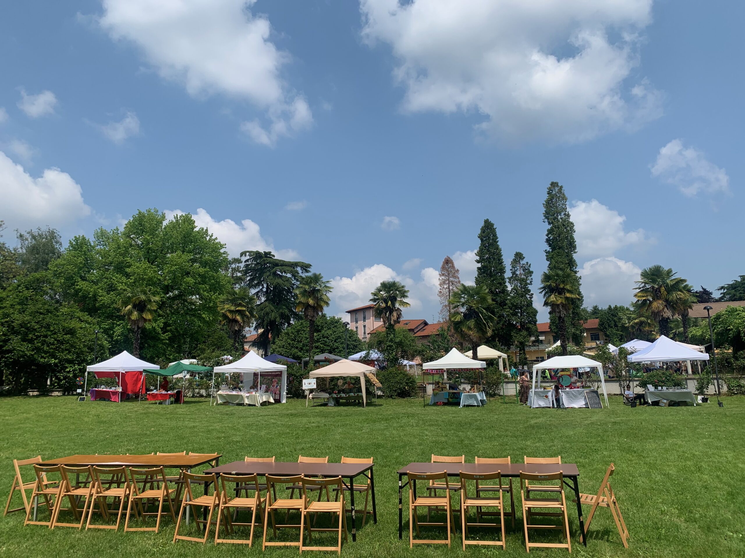 Tavolo informativo AVP® sotto gli alberi di gelso nel parco della villa Scalabrini di Cermenate