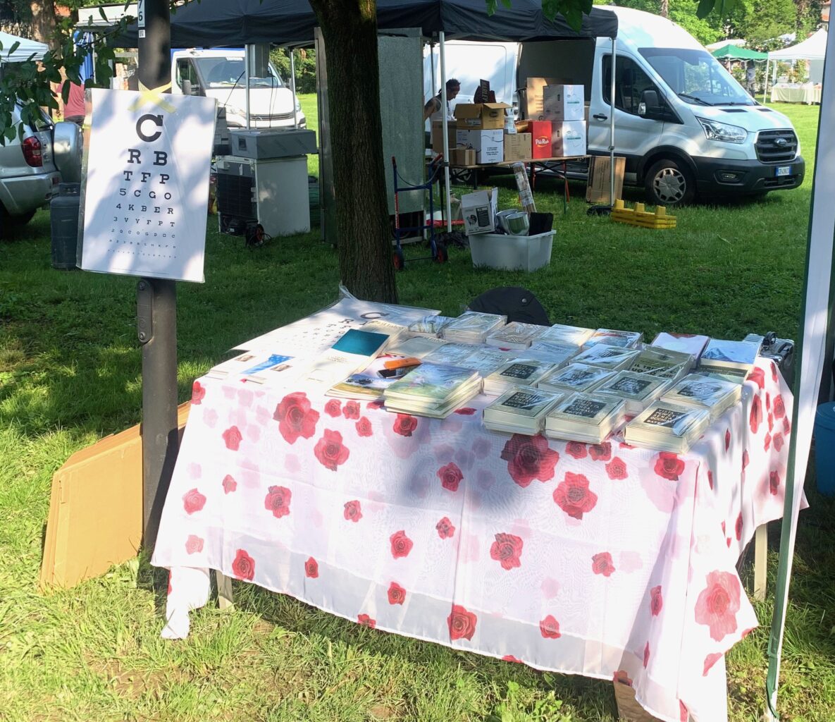 Pur troppo, poco prima delle ore 17 si sono formate delle nuvole nere gigantesce sopra la nostra testa e a un certo punto ha iniziato a piovere, prima piano e poi sempre piú forte, per cui tutti se la sono data a gambe levate e siamo riusciti a malapena a salvare i libri dall’ acquazzone nascondendoli sotto il tavolo, e meno male che – per fortuna – erano tutti protetti dalla plastica trasparente!